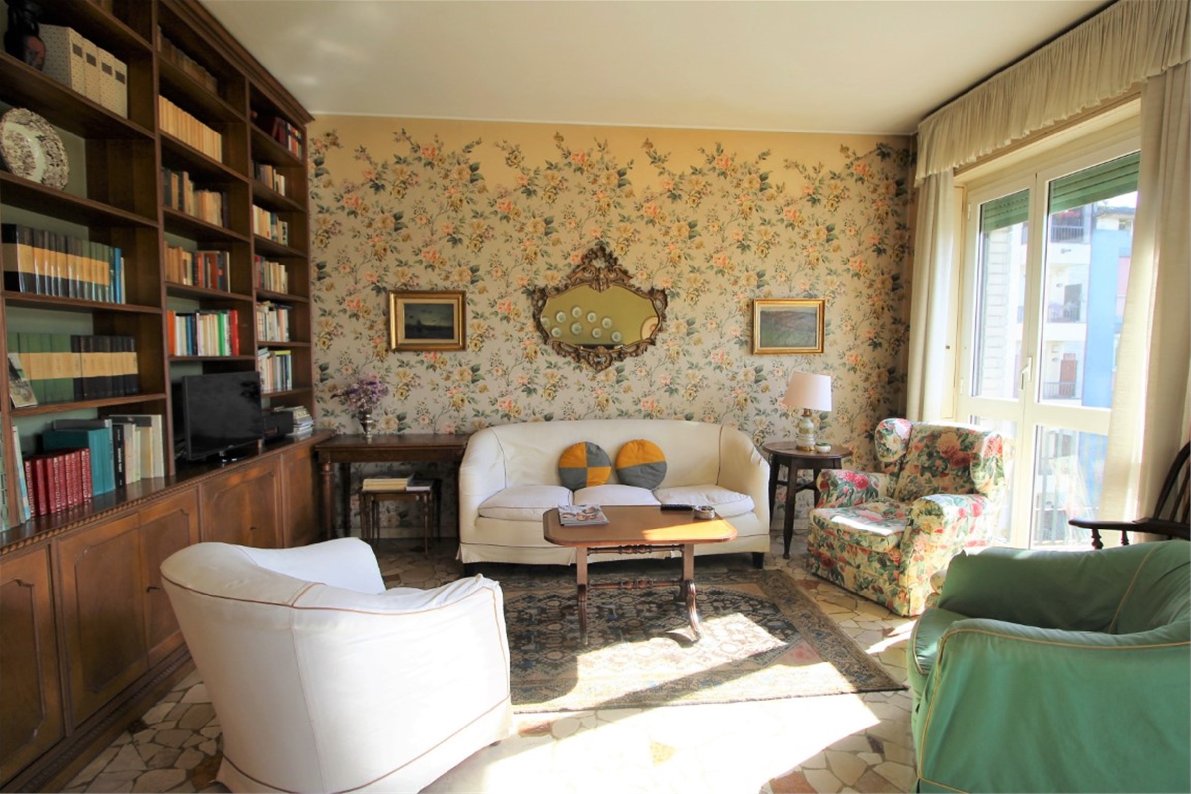 La superficie abitativa di circa 150 mq si compone di un comodo ingresso con guardaroba che introduce al grande e luminosissimo salone dotato di 2 graziosi balconcini e caratterizzato da un piacevolissimo affaccio panoramico aperto sui giardini di Largo Isabella d’Aragona e sull’antico tracciato delle mura spagnole. La cucina è abitabile e dotata di un balconcino rivolto verso il cortile interno. La zona notte è composta da 3 camere di cui 2 matrimoniali e due bagni con finestra. Ampi spazi nei disimpegni sono stati riservati alle armadiature.