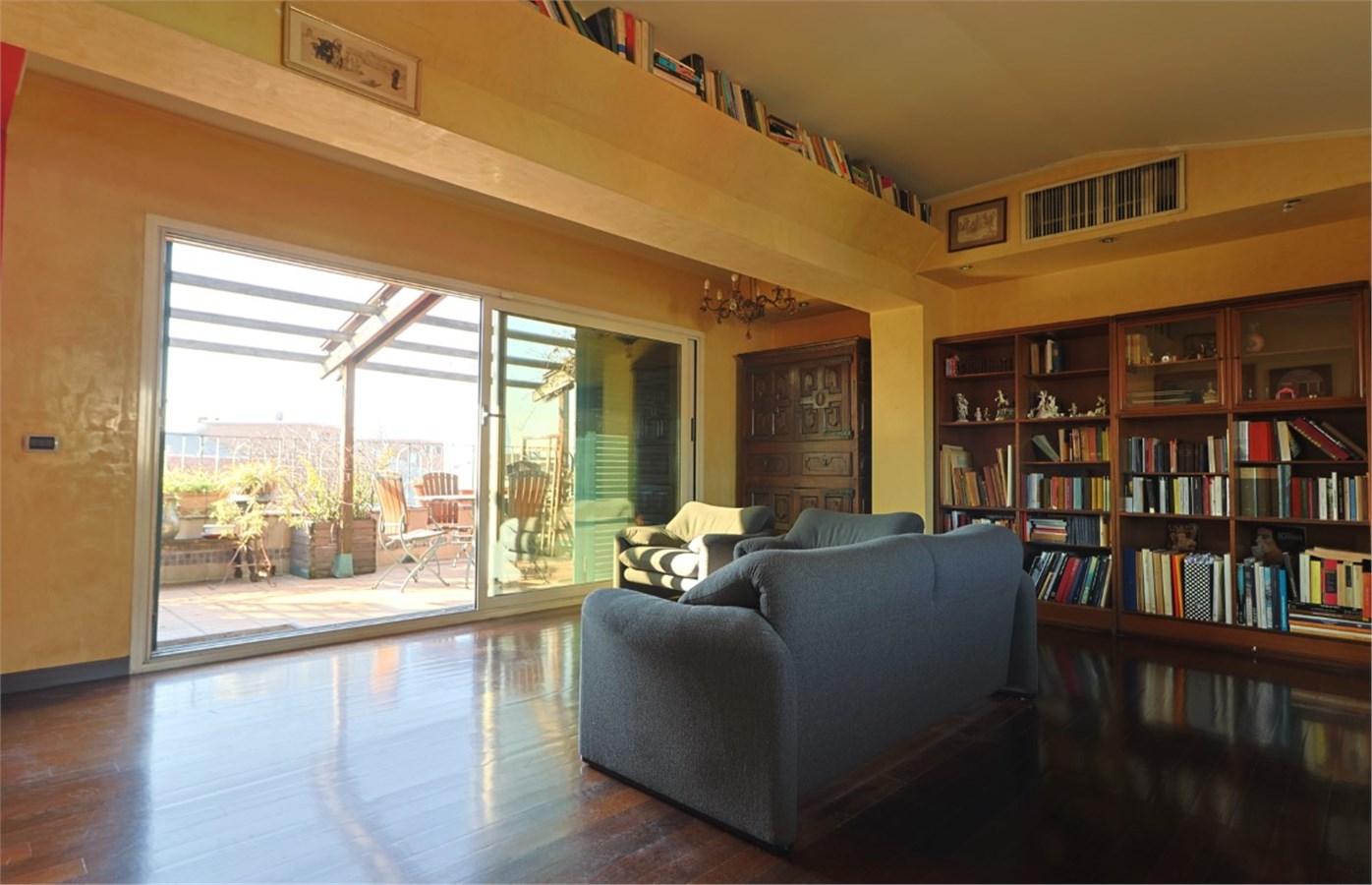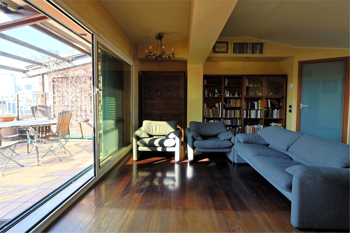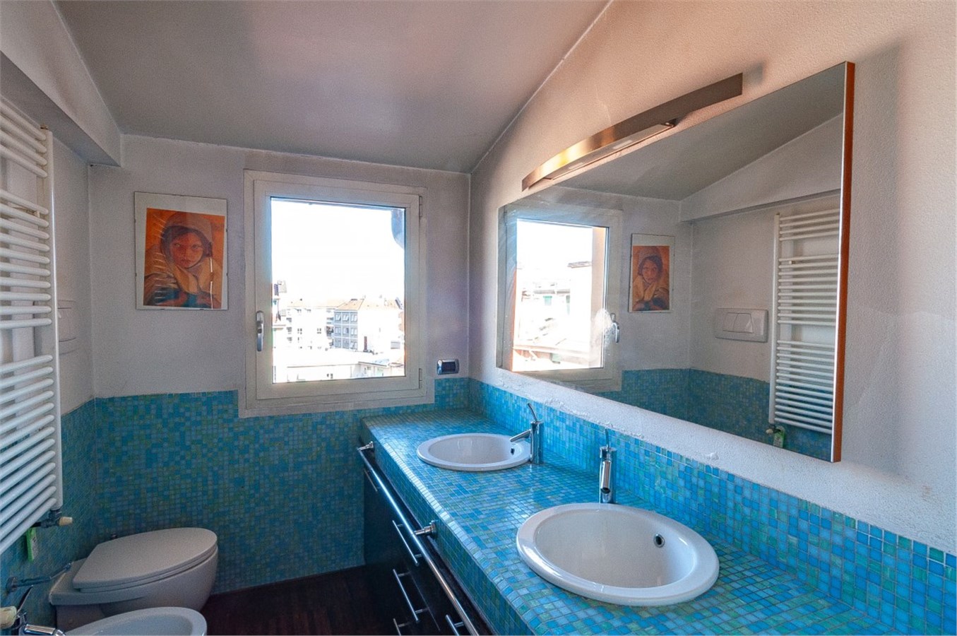 La soluzione abitativa è frutto di un geniale recupero dei sottotetti: l’appartamento si trova all’8° e ultimo piano e gode quindi di una bellissima esposizione panoramica, un affaccio arioso e riservato.