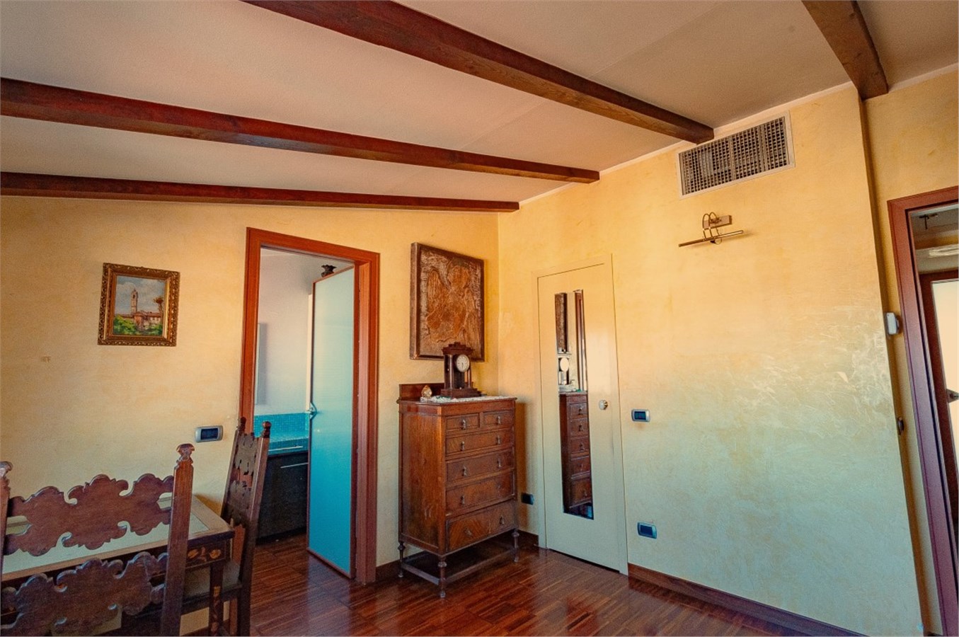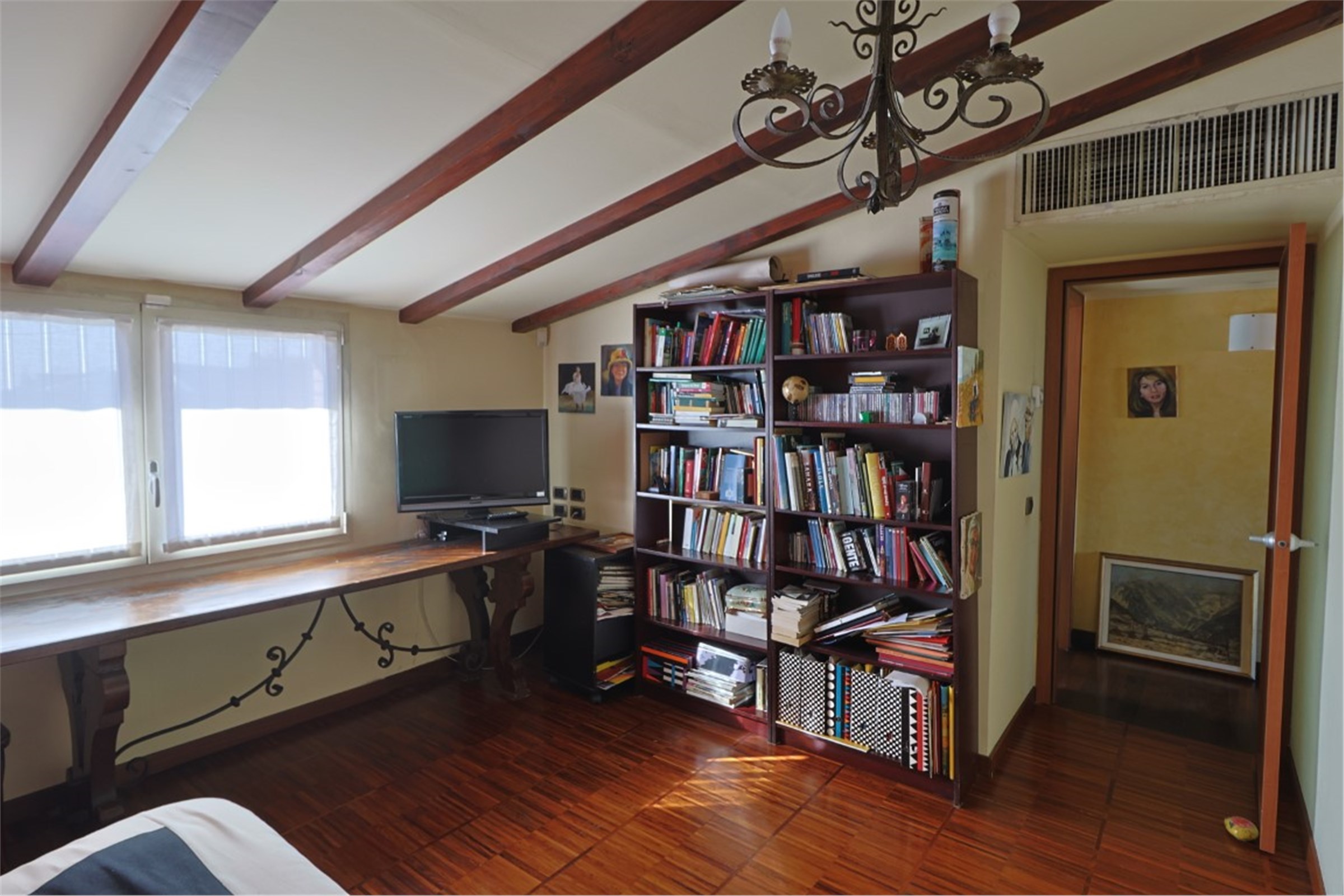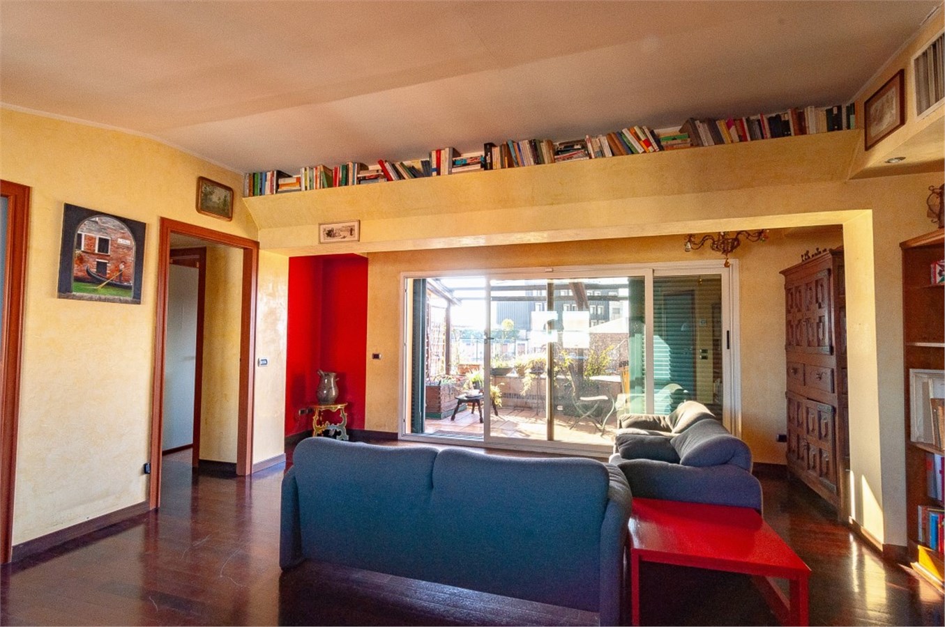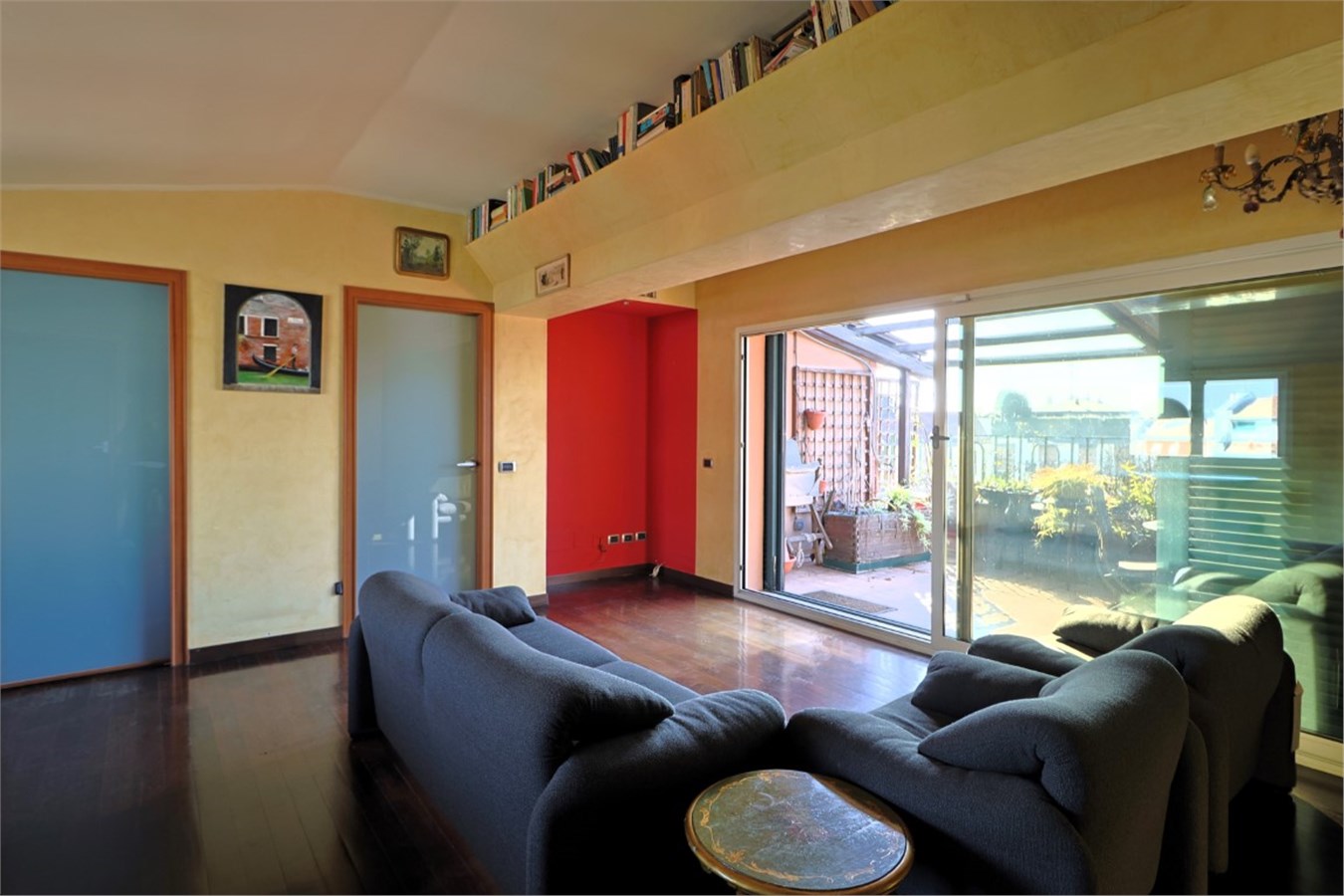 La soluzione abitativa è frutto di un geniale recupero dei sottotetti: l’appartamento si trova all’8° e ultimo piano e gode quindi di una bellissima esposizione panoramica, un affaccio arioso e riservato.