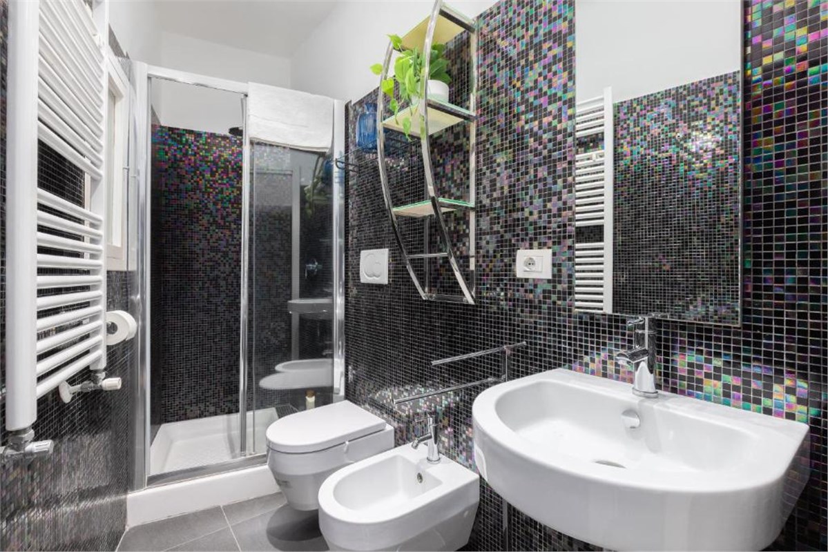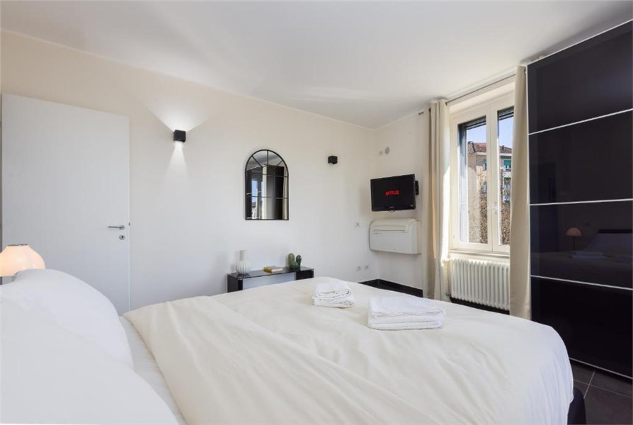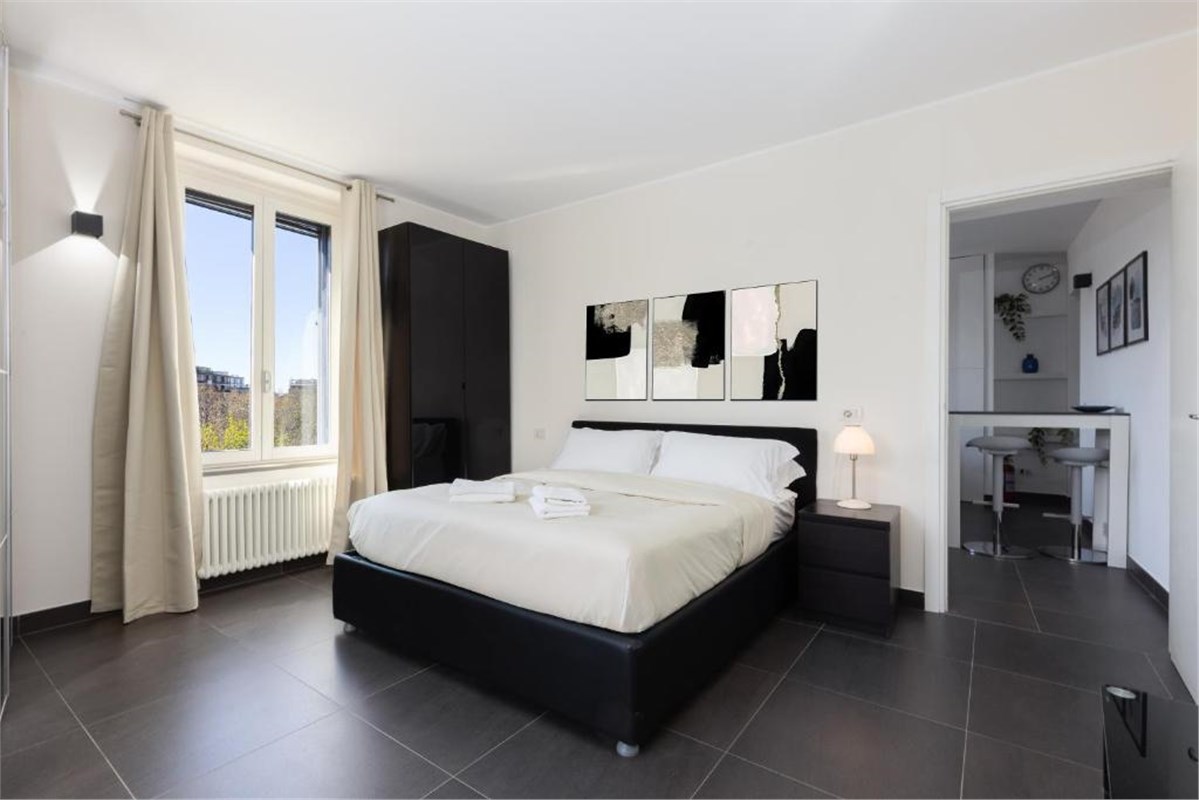 La camera da letto è luminosissima e molto ampia. Oltre al letto matrimoniale ospita 2 armadi e una comoda zona adibita a studio/smart working. Il bagno, rivestito con piastrelline della Bisazza, ha la doccia e una finestra sul cavedio.